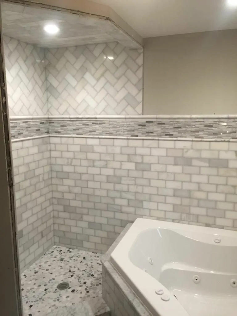 This project focuses on a custom tile shower remodel that connects a walk-in shower to an integrated soaking tub. The work improved both layout and function. The lower walls feature marble-look subway tiles, which create a clean and consistent surface. The upper walls use a herringbone pattern to add visual movement. A mosaic accent band separates the tile sections and defines the transition. The shower floor includes pebble-style tiles that support drainage and add texture to the space.